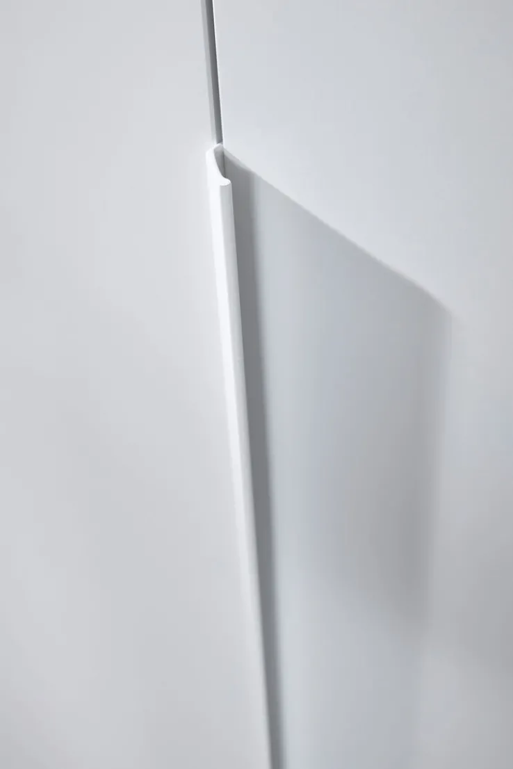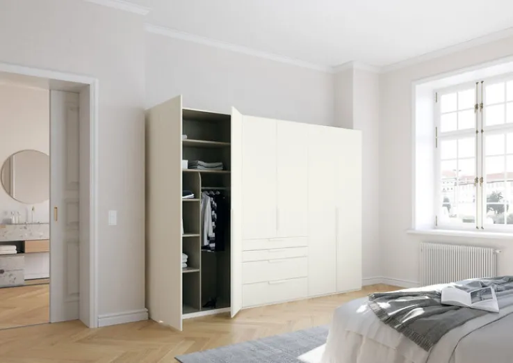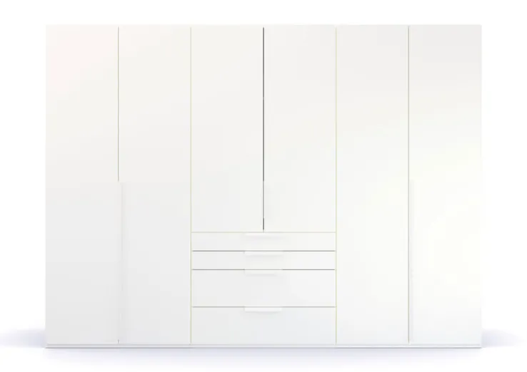 PURISMA ist einer von vielen funktionalen und hochwertigen Möbelstücken, die das Zuhause verschönern. Diverse Kleiderstangen und Einlegeböden hinter den Drehtüren ermöglichen das Sortieren und strukturierte Einräumen des Kleiderschranks. Zusätzlich gibt es vier geräumige Schubladen in der Mitte. Schubladen und Drehtüren sind gedämpft. Innen gibt es zudem einen Spiegel und einen praktischen Krawattenhalter. Die praktischen großen Griffe sind farblich angepasst.