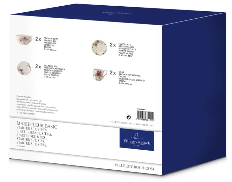 Das Kombiservice „MARIEFLEUR BASIC“ aus hochwertigem Porzellan bietet eine harmonische Kombination aus Funktionalität und ästhetischem Design. Das Set besteht aus acht Teilen, darunter zwei Müslischalen mit einem Fassungsvermögen von 500 ml, zwei flache Teller mit einem Durchmesser von 26,8 cm, zwei weitere flache Teller mit einem Durchmesser von 21,5 cm und zwei Tassen mit einem Volumen von 260 ml. Die runde Form der Geschirrteile sorgt für eine zeitlose Eleganz, die sich in jede Tischdekoration einfügt.