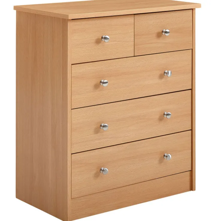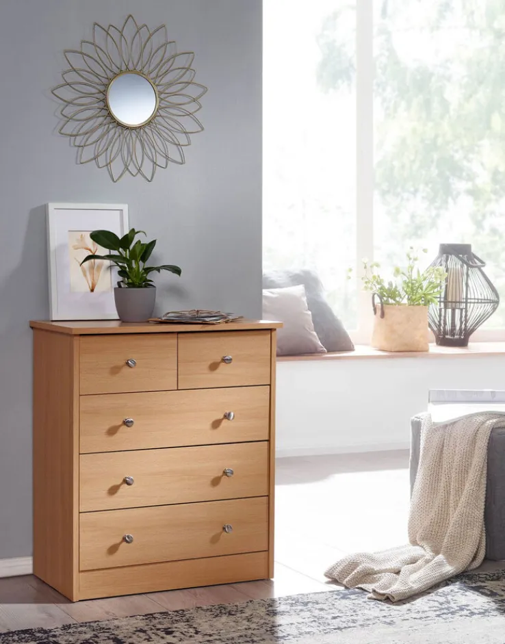 Die Kommode besteht aus buchefarbig folierter Holznachbildung und lässt sich mit maximal 30 kg belasten. Ihr klassisches Design perfektionieren die chromfarbigen Griffe. Noch wichtiger als die ansprechende Optik ist jedoch der umfassende Stauraum. In drei großen und zwei kleinen Schubkästen bietet das Möbelstück viel Platz für Wäsche und vieles mehr. Mit dem schlichten Aussehen und warmer Holzfarbe verleiht die Kommode dem Wohnraum zudem ein gemütliches Ambiente, in dem sich Familie und Gäste wohlfühlen.
