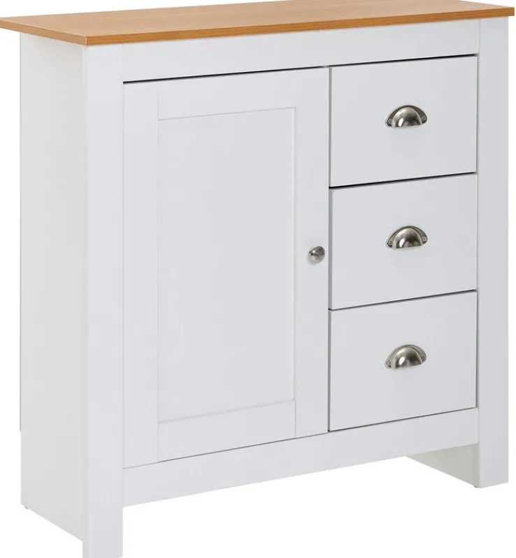 Die Kommode besteht aus solider Holznachbildung in Weiß und zieht dank braun abgesetzter Oberplatte und antik wirkenden Griffen alle Blicke auf sich. Beschichtet mit Melaminharz, sind die Oberflächen für die tägliche Beanspruchung ausgerichtet. Doch nicht nur in Sachen Qualität und Optik überzeugt die Kommode. In drei Schubkästen sowie hinter einer Drehtür bietet sie zudem jede Menge Stauraum. Für ein harmonisches Ambiente empfiehlt es sich, die Kommode mit weiteren Möbelstücken der Serie zu kombinieren.