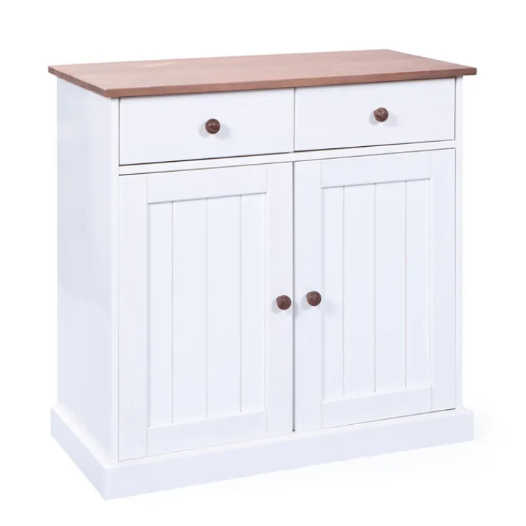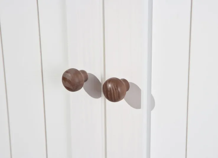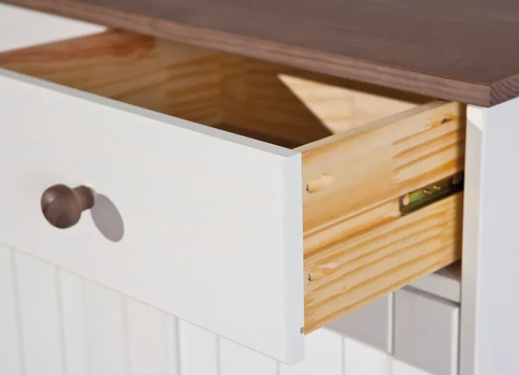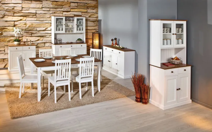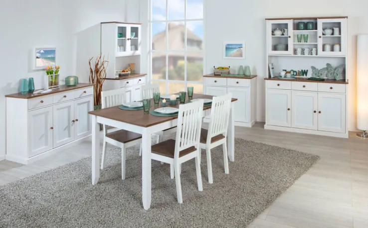 Die formschöne Kommode verfügt über zwei Drehtüren. Über diesen beiden Türen sind zwei Schubkästen arrangiert. Insgesamt überzeugt das Modell im Esszimmer mit viel Stauraum. Während die Fronten und der Korpus weiß strahlen, sorgen die vier runden Knöpfe an Schubkästen und Türen sowie die obere Ablagefläche in Braun für einen angenehmen farblichen Kontrast. Das Modell hat ein Eigengewicht von 31,4 Kilogramm.