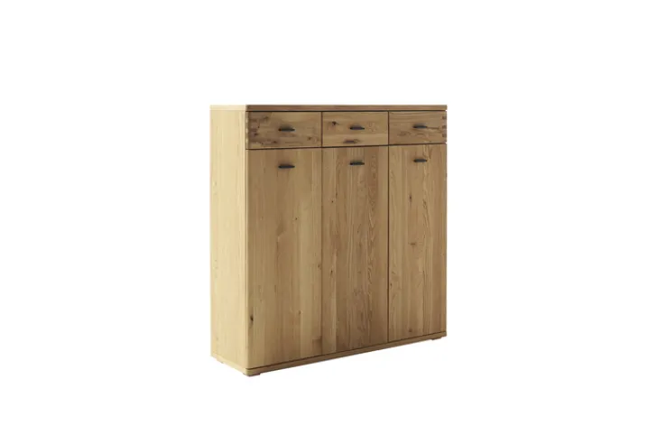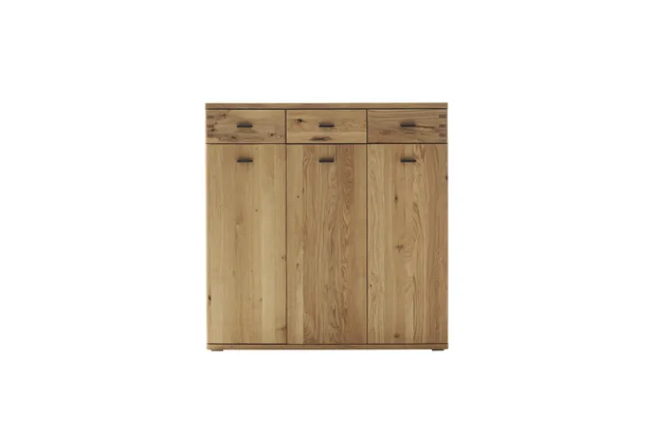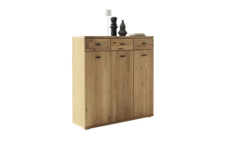 Teilmassive Ast-/Balkeneiche präsentiert sie sich in einem warmen Braunton, der durch die natürliche Holzmaserung unterstrichen wird. Die Oberfläche ist melaminbeschichtet, was für eine robuste und pflegeleichte Nutzung sorgt. Die schwarzen Griffe setzen einen stilvollen Kontrast und verleihen der Kommode eine zeitgemäße Note.