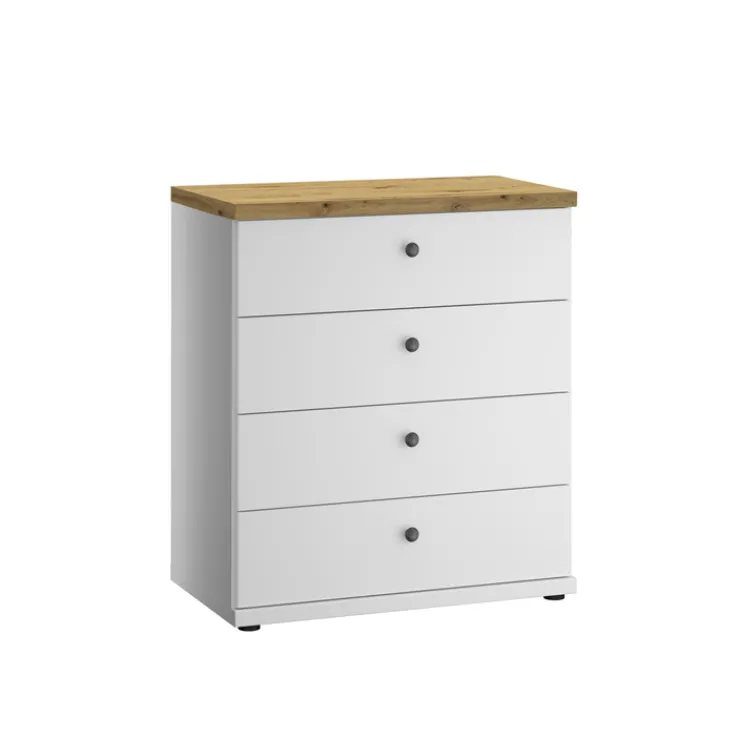 Die Kommode MARLOW zeigt eine weiße Holznachbildung und einen Absatz in brauner Bianco-Eiche. Sie verfügt über 4 Schubkästen. Ihre Breite liegt bei 75 cm, die Höhe bei 86 cm und die Tiefe bei 42 cm.