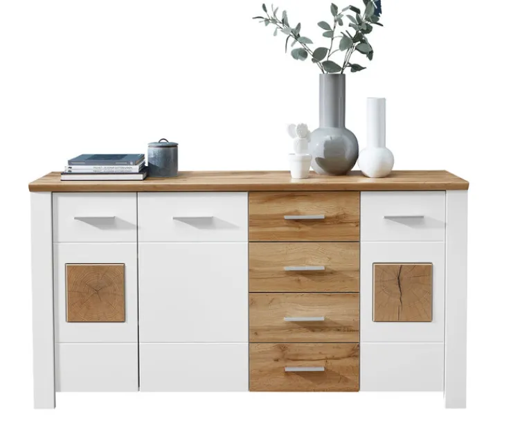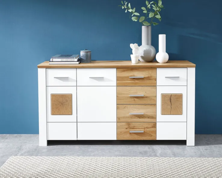 Die Kommode aus der Serie MATERIO vereint modernes Design mit praktischer Funktionalität. Mit einer Breite von 164 cm, einer Höhe von 86 cm und einer Tiefe von 39 cm bietet sie ausreichend Stauraum für diverse Wohnaccessoires. Die Kombination aus weißem Korpus und braunen Elementen in Eichenoptik verleiht der Kommode einen zeitlosen und eleganten Look. Die Oberfläche ist matt lackiert, was für eine angenehme Haptik sorgt.