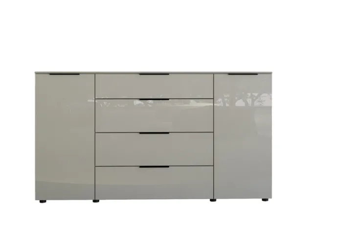 Die exklusive Kommode SANTORIN 180 x 99 cm in Sandgrau überzeugt durch ihre elegante, moderne Optik. Der Korpus aus Holznachbildung mit Melaminbeschichtung sorgt für Langlebigkeit und eine pflegeleichte Handhabung. Er harmoniert perfekt mit der Glasfront. Die Kommode SANTORIN ist mit zwei Türen und vier Schubkästen mit praktischem Softclose-System ausgestattet und verfügt über großzügigen Stauraum und eine Ablagefläche. Vier verstellbare Einlegeböden ermöglichen eine individuelle Raumaufteilung. Lip-Griffe aus Chrom unterstreichen das zeitgemäße Design. Die Kommode lässt sich ideal mit dem passenden Untergestell kombinieren, welches optinal bestellbar ist und fügt sich in jedes moderne Zuhause ein. SANTORIN ist funktional und setzt einen stilvollen Akzent im Wohnzimmer oder Schlafzimmer.