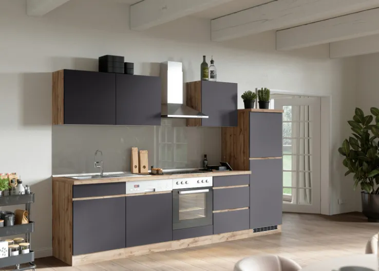 Die Küchenzeile AALBORG wird mit einer Länge von 300 cm und inklusive aller Elektrogeräte geliefert. Neben dem Elektroherd in Kombination mit einem Kochfeld und einer Kühl-Gefrierkombination gehören auch ein Geschirrspüler und eine Luftfilterhaube zur Ausstattung. Korpus und Sockel sind mit einem Wotan Eiche Dekor versehen, ebenfalls die CPL-beschichtete, 38 mm dicke Arbeitsplatte. Alle Fronten, einschließlich der von Geschirrspüler und Kühl-Gefrierkombination sind matt-grau beschichtet.