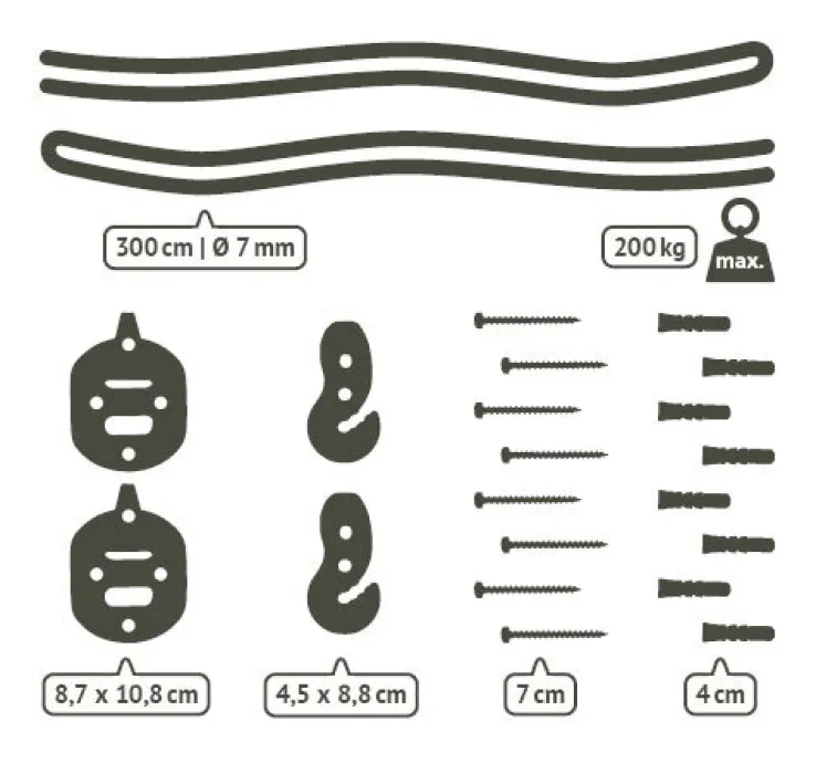 Setartikel: jaAnzahl Teile im Set: 22 Stk.Länge Setartikel 1: 300 cmSetartikel-Inhalt 1: SeilAnzahl Setartikel-Inhalt 1: 2 Länge Setartikel 2: 8,8 cmBreite Setartikel 2: 4,5 cmSetartikel-Inhalt 2: HakenAnzahl Setartikel-Inhalt 2: 2 Länge Setartikel 3: 10,8 cmBreite Setartikel 3: 8,7 cmSetartikel-Inhalt 3: WandhalterungAnzahl Setartikel-Inhalt 3: 2 Länge Setartikel 4: 7 cmAnzahl Setartikel-Inhalt 4: 8 Anzahl Setartikel-Inhalt 5: 8 Durchmesser Setartikel 1: 0,7 cmLänge Setartikel 5: 4 cm