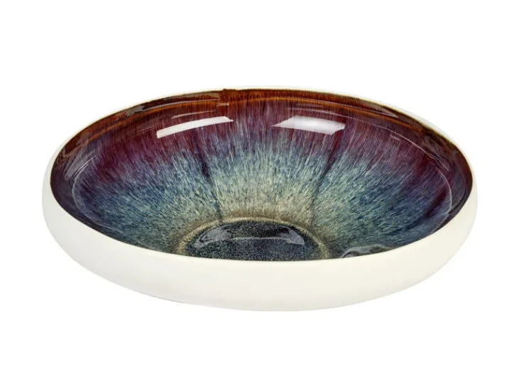 Die runde Dekoschale TAKEO 30 cm der Marke LAMBERT ist außen weiß und innen mit einem individuellen Farbverlauf versehen. Hergestellt ist die stilvolle Schale aus hochgebranntem Keramikmaterial. Eine reaktive Glasur erzeugt den Mystic Topas-Farbverlauf, der bei jedem Teil anders ausfällt.