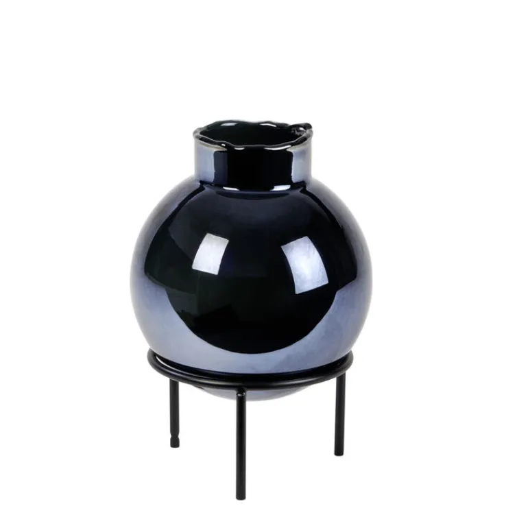 Die dekorative Vase für den Innenbereich ist aus hochwertiger Keramik gefertigt. Die Oberflächen sind innen und außen glasiert. Der Ständer der Vase besteht aus Metall und ist mehrfach in der Farbe schwarz lackiert.