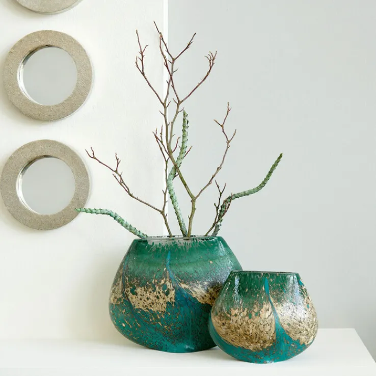 Die LAMBERT Vase TIZIAN ist 20,5 cm hoch. Sie zeigt die Farbe Ocean Multi, die einen wunderbaren Farbverlauf aufweist. Das Gefäß ist 25 cm breit und 15 cm tief. Das Glas ist grün und goldfarbig.