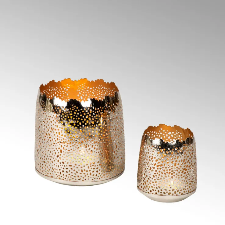 Das LAMBERT Windlicht SONAM hat eine Höhe von 12,5 cm und einen Durchmesser von 12,5 cm. Das ungewöhnliche Design mit dem Lochmuster und dem unregelmäßigen Rand macht es zu einem wunderschönen Blickfang in jedem Raum.