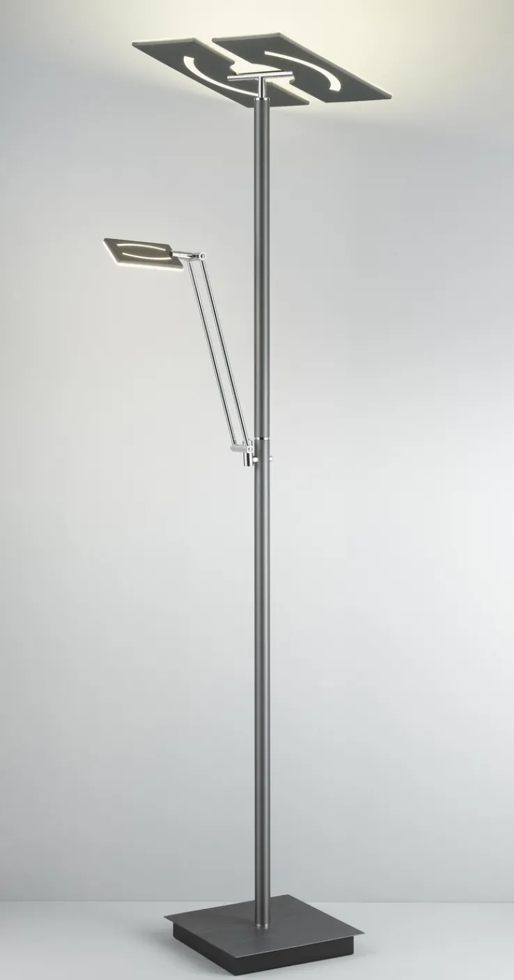 Die Stehleuchte MATEO vereint modernes Design mit hoher Funktionalität. Mit einer Höhe von 182 cm bietet sie eine beeindruckende Präsenz in jedem Raum. Die Hauptfarbe der Leuchte ist Grau, ergänzt durch chromfarbene und schwarze Akzente, die ihr ein elegantes und zeitgemäßes Aussehen verleihen. Die quadratische Form des Sockels sorgt für Stabilität und fügt sich nahtlos in moderne Wohnräume ein.