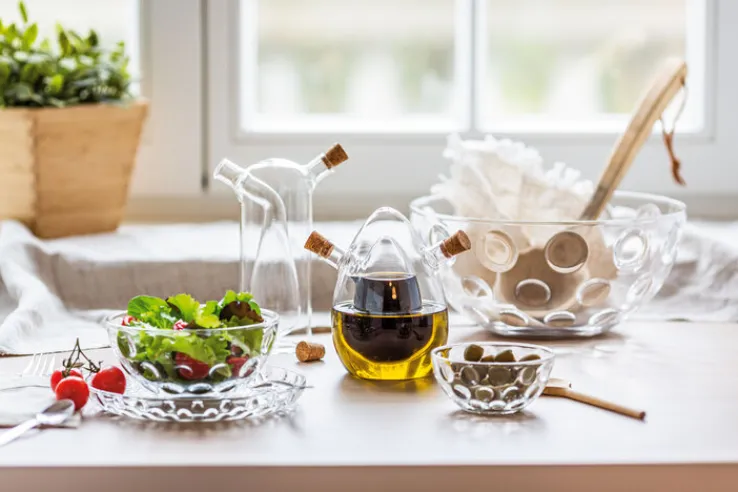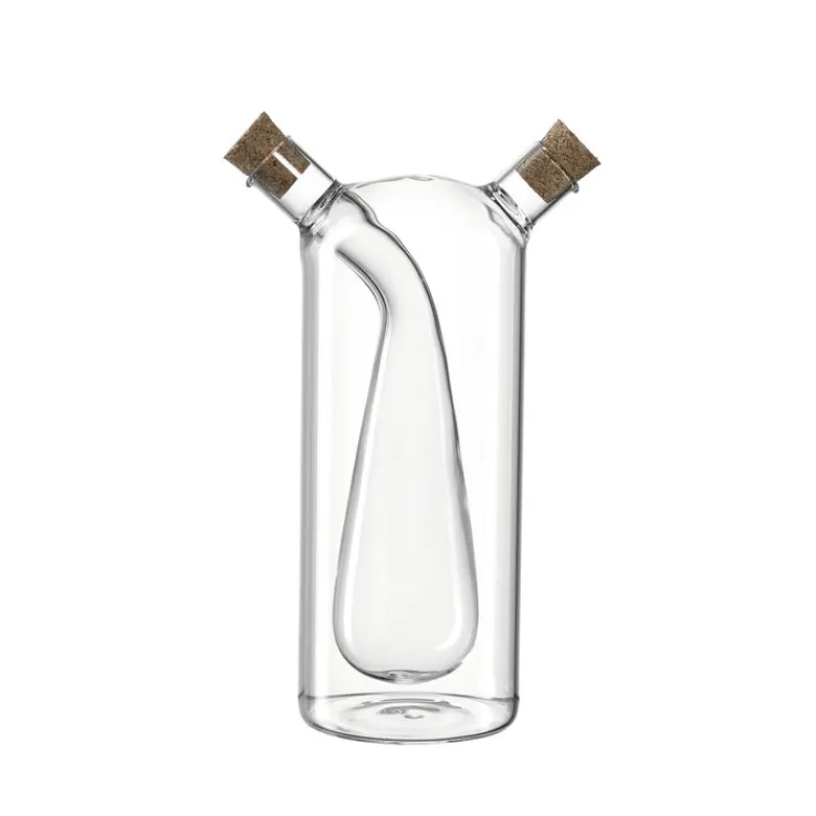 Die formschöne Essig-/Ölflasche CUCINA aus dem Hause LEONARDO wird mit ihrem extravaganten Design zum Hingucker auf dem Esstisch. Sie beeindruckt mit einer praktischen 2 in 1 Funktion und ist so geformt, das sich eine Flasche in der anderen befindet. Jede Flasche hat einen separaten Ausguss und kann mit einem Stopfen aus Kork verschlossen werden.