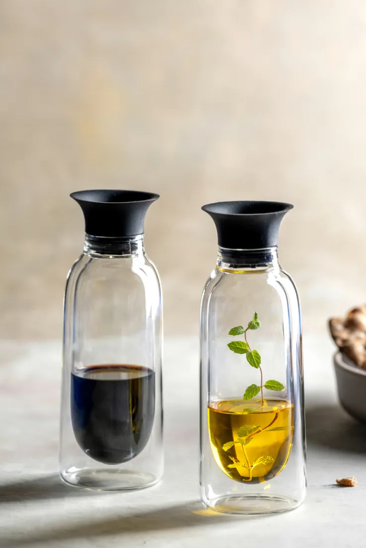 Im 2er Set sind die beiden Essig-/Ölflaschen DUO super schick und enorm praktisch. Mit einem Volumen von 170 ml haben sie genau die richtige Größe, um Speisen sowohl beim Kochen als auch am Tisch den perfekten Schliff zu verleihen.