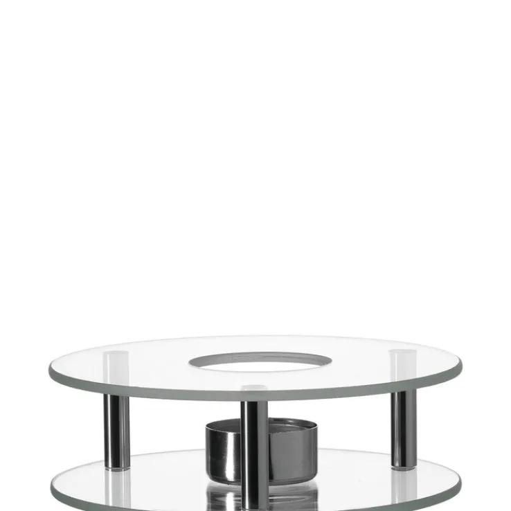Optisch besticht das Stövchen SCALDINO durch zwei schöne runde Glasplatten die von drei eleganten Stützen verbunden werden.