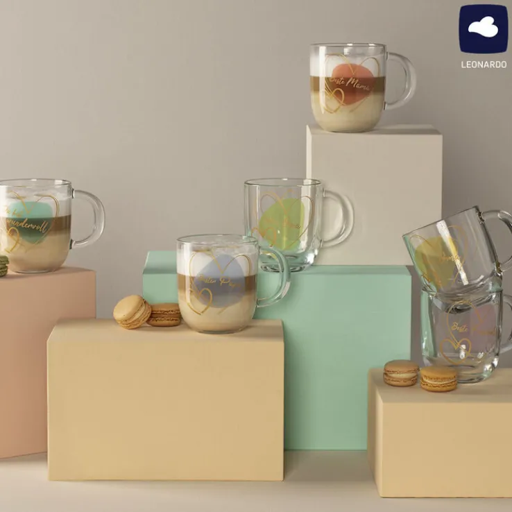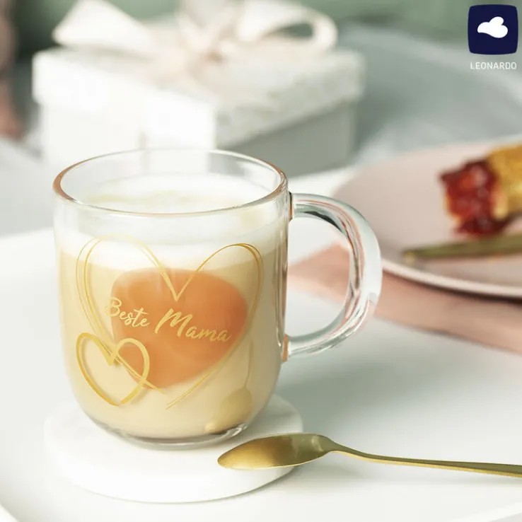 Die runde LEONARDO Tasse BESTE MAMA besteht vollständig aus transparentem Glas. Sie fasst 400 ml. Nach Gebrauch kann sie in die Spülmaschine gegeben werden.