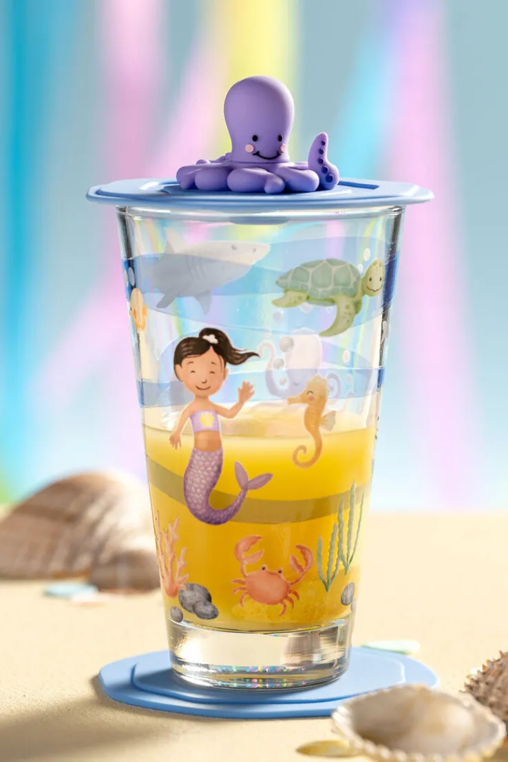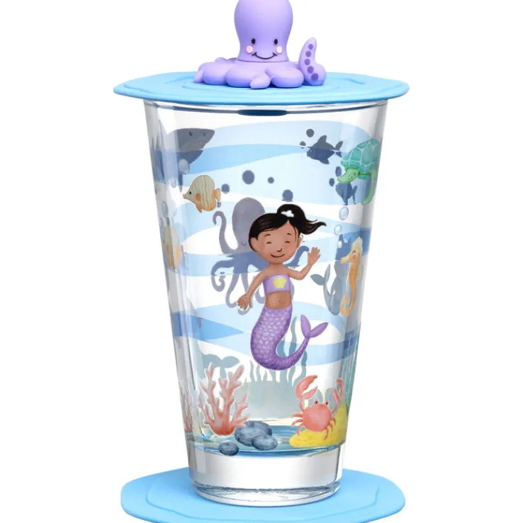 Eine Meerjungfrau und ein Meermann tanzen auf dem konischen Glas zwischen dem Seetang mit den Fischen und anderem Meeresgetier. Durch den Deckel, der über den Rand des Glases hinausragt, wird verhindert, dass Staub oder Insekten in das Getränk gelangen. Um den Deckel einfacher anzuheben, sitzt eine lustige, winkende Krake mittig auf dem hellblauen Deckel. Das Glas selbst ist konisch und hat einen starken Boden für die Standfestigkeit. So macht Trinkglas BAMBINI AVVENTURA Meer Set gute Laune und spricht die Fantasie an.