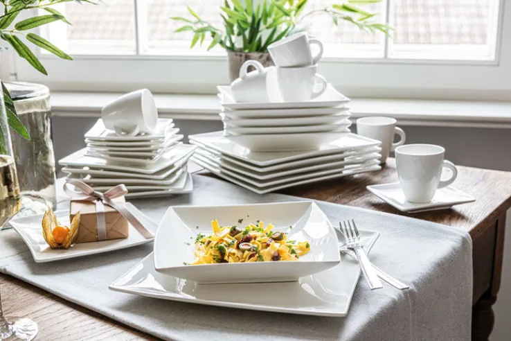 Mit dem Design von EAST MEETS WEST hat die Qualitätsmarke MAXWELL WILLIAMS ein zeitloses Geschirrdesign entwickelt, das den scheinbaren Gegensatz zwischen traditioneller Eleganz und moderner Schlichtheit absolut mühelos überbrücken kann. Das 30-teilige Set besteht aus jeweils 6 flachen und tiefen Tellern, Desserttellern, Kaffeetassen und Untertassen und ist damit auch die perfekte Grundausstattung für einen neu begründeten Haushalt. Da alle Teile des Sets in reinem Weiß erstrahlen und keinerlei bunte Dekoranteile haben, können diese sehr vielseitig mit anderen Geschirrteilen kombiniert werden. Während die Tassen in ihrer Gestaltung durchaus traditionell anmuten, sind die modern gestalteten Teller allesamt viereckig gestaltet. So heben sie sich deutlich vom klassisch runden Speise- und Dessertteller ab und erlauben besondere Formate der auf ihnen angerichteten und mit unter spektakulär in Szene gesetzten Speisen. Da sich das Geschirrset durch eine hohe Material- und Verarbeitungsqualität auszeichnet, ist es ohne Probleme gefriergeeignet, mikrowellenfest und backofengeeignet. Das MAXWELL WILLIAMS Geschirrset EAST MEETS WEST wird praktischen und ästhetischen Anforderungen an eine moderne Geschirrausstattung aus klassischem Porzellan in Weiß absolut gerecht und kann mit seiner ästhetischen Optik viel zum Genusserlebnis bei Tisch beitragen.
