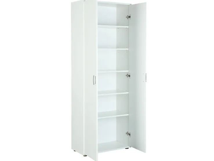 Der Mehrzweckschrank PEPE mit seinem weißen Korpus und den Maßen 70 x 189 x 34 cm bietet viel Staufläche hinter den gut schließenden Türen. Die fünf Einlegeböden im Inneren des Schrankes bieten viel Stauraum und sind bestens für Bücher oder andere Memorabilien geeignet. Der Schrank steht auf stabilen Füßen aus Kunststoff und hebt sich somit leicht vom Boden ab.