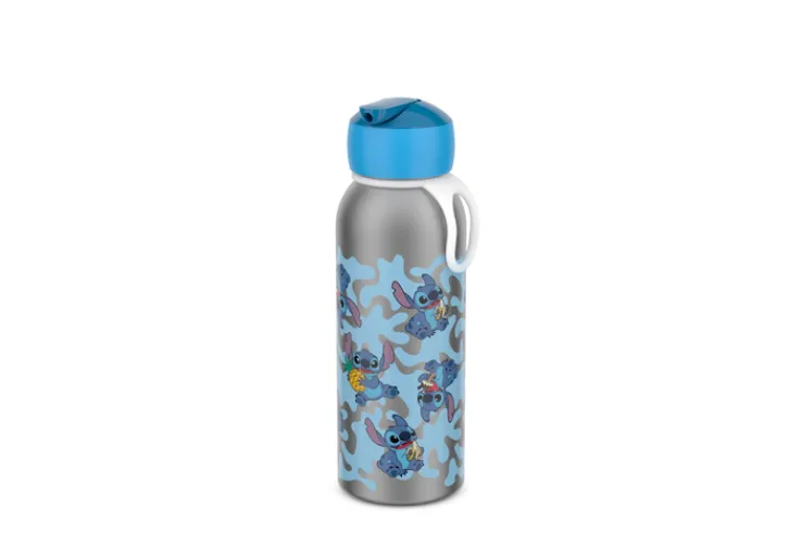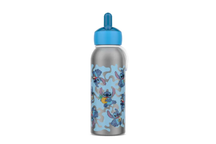 Das Design der Flasche ist modern und mehrfarbig, mit einem auffälligen Muster, das den Charakter Stitch zeigt. Die runde Form und die Kombination aus Polypropylen und Silikon machen die Flasche nicht nur praktisch, sondern auch stilvoll. Der blaue Deckel ergänzt das Gesamtbild und bietet eine einfache Handhabung. Ideal für den täglichen Gebrauch, ob im Büro, beim Sport oder unterwegs.