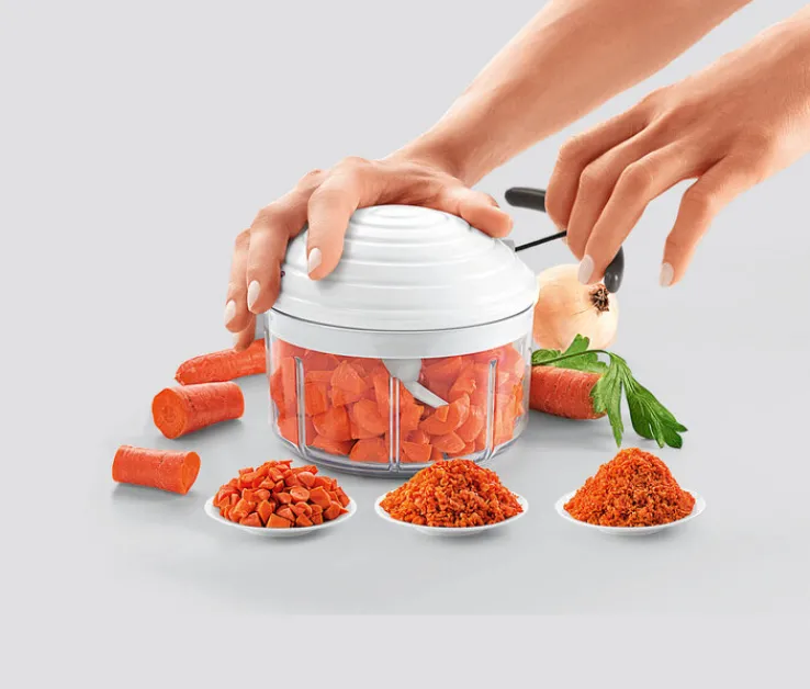 Der vielseitige Zerkleinerer von metaltex ist das ideale Küchengerät zum Mixen, Rühren und Raspeln in vier verschiedenen Schnittgrößen. Ausgestattet mit hochwertigen Klingen aus rostfreiem Edelstahl zerkleinert der ROTO MAC Gemüse, Obst, aber auch Nüsse zum Backen genau auf die gewünschte Größe. Durch den intelligenten Zugmechanismus ist er leicht zu bedienen und liefert immer gleichbleibende Ergebnisse. Auch zum Passieren von Suppen, Pesto, Desserts oder Soßen ist der Zerkleinerer gut geeignet.