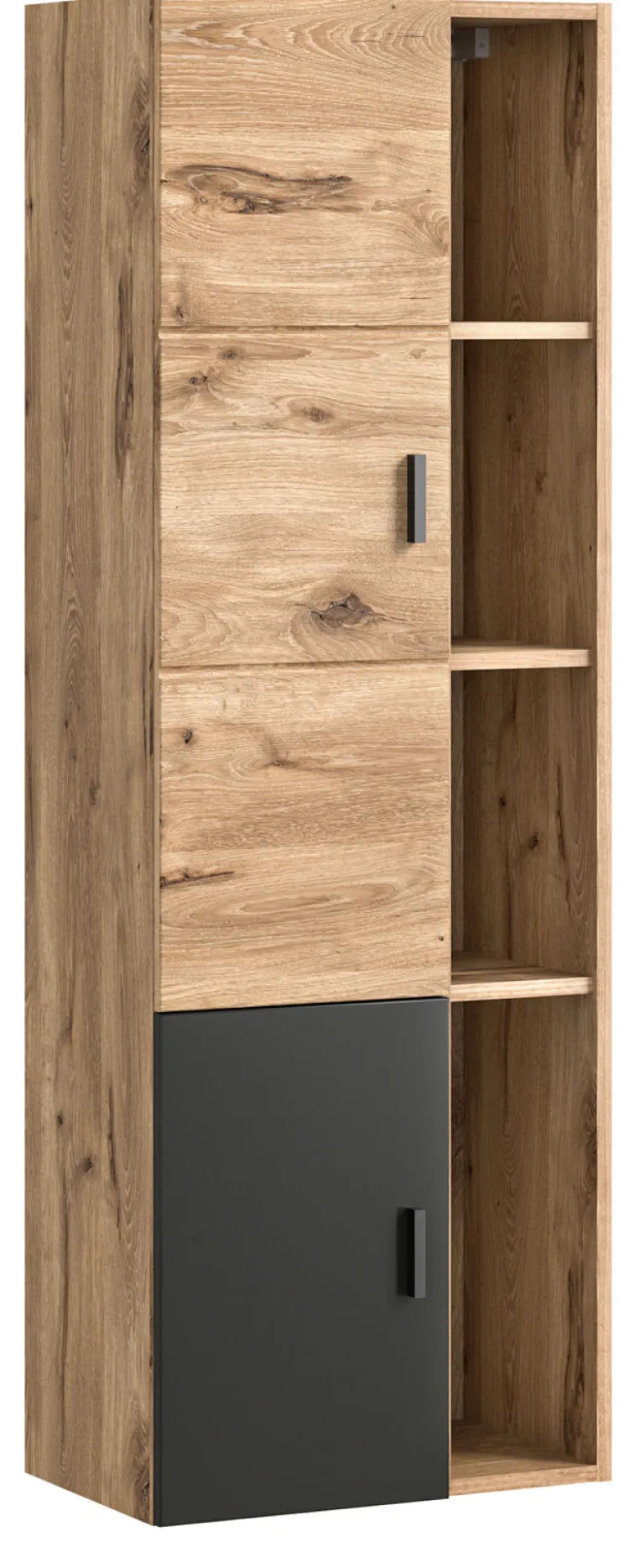 Der Midischrank GRADO in Nox Eiche und Grau ist 144 cm hoch, 48 cm breit und 35 cm tief. Hinter zwei Drehtüren und in vier offenen Fächern findet sich reichlich Stauraum.