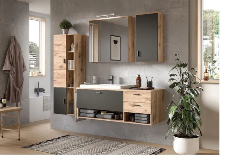 Die perfekte Ergänzung zur Serie GRADO: Der Midischrank überzeugt durch seine hochwertige Verarbeitung, er ist für den Innenbereich konzipiert und perfekt für Bäder ausgestattet. Auch optisch macht der Badschrank GRADO viel her, besonders gefällt der Farbkontrast an der Front, der für eine außergewöhnliche Optik sorgt. Minimalistische, dunkelgraue Griffe sind praktische Helfer und trendiges Accessoire. Der Midischrank kommt zerlegt ins Haus, eine einfache Montageanleitung und Pflegehinweise befinden sich am Artikel.