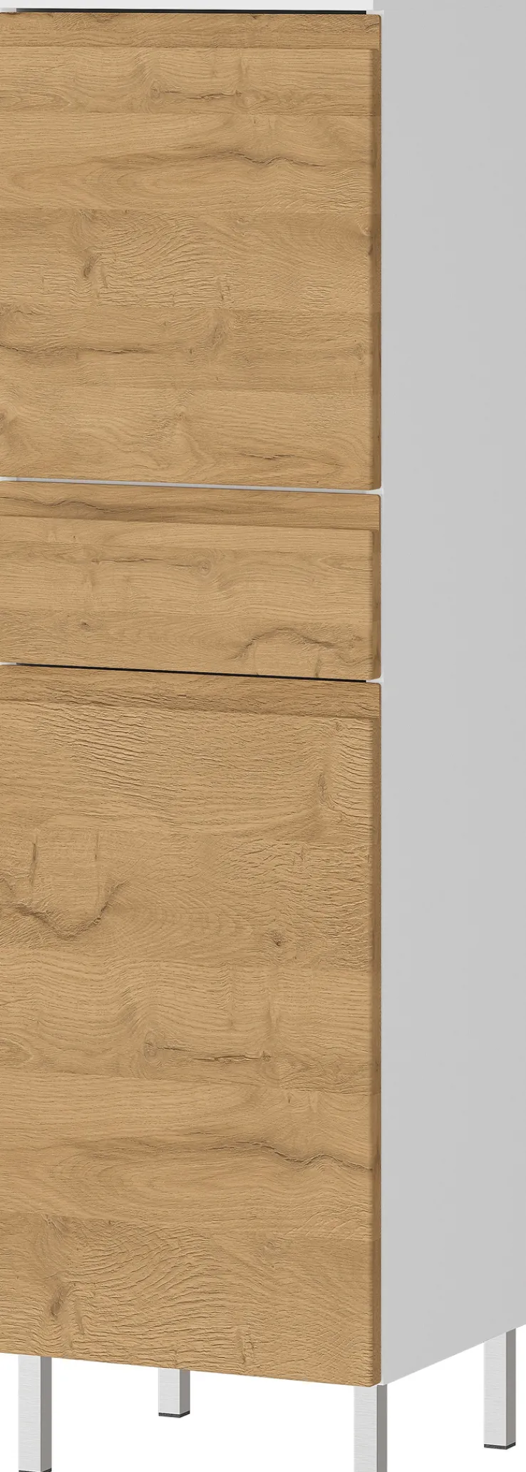 Der Midischrank SOPHIE überzeugt durch hochwertige Verarbeitung und eine warme, natürliche Ausstrahlung. Gefertigt ist er in Holznachbildung mit einem weiß lackierten Korpus und Fronten in Grandson-Eiche Optik. Für sicheren Stand sorgen die Füße aus Metall. Der Schrank harmoniert wunderbar mit weiteren Stücken der Badmöbel-Serie, kann aber auch alleine platziert werden.