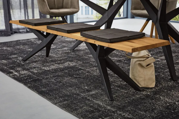 Der Materialmix aus massiver Eiche und schwarzem Metall macht aus der modernen Sitzbank TAMINA aus dem Hause Musterring ein formschönes Möbelstück für den Essbereich. Auf der robusten Bank im angesagten Industriestil finden drei Personen bequem Platz.