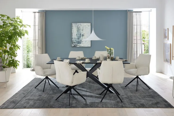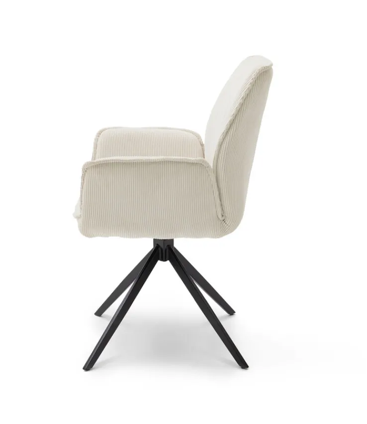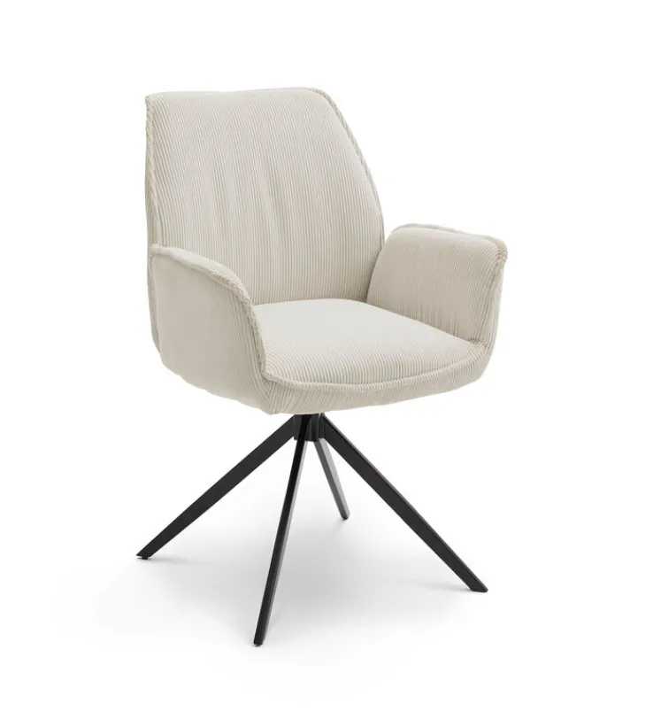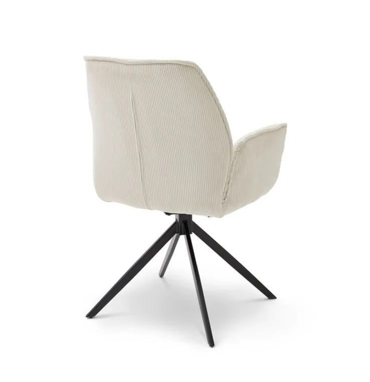 Der formschöne Stuhl kann um exakt 180 Grad gedreht werden. Im Sitz, der über eine Rückholfunktion verfügt, ist eine Wellenfederung integriert. Das Modell kann bis zu einem Gewicht von 140 Kilogramm belastet werden. Das Stativgestell mit den vier Füßen besteht aus schwarzem Eisen. Der Bezug von Sitz, Lehne und Armlehnen ist aus Cord.