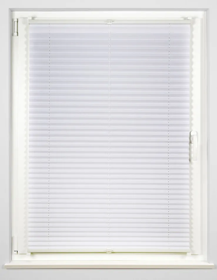 120 Zentimeter breit und 130 Zentimeter hoch, wird das weiße Plissee von my deco ohne Bohren im Fenster befestigt. Das Befestigungsmaterial für das flexibel verstellbare Plissee liegt bei.