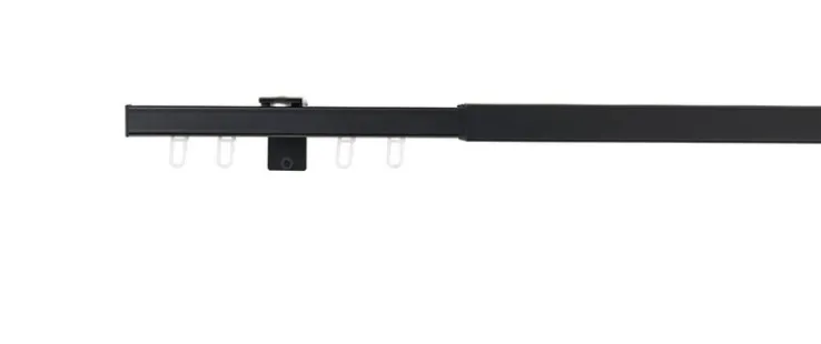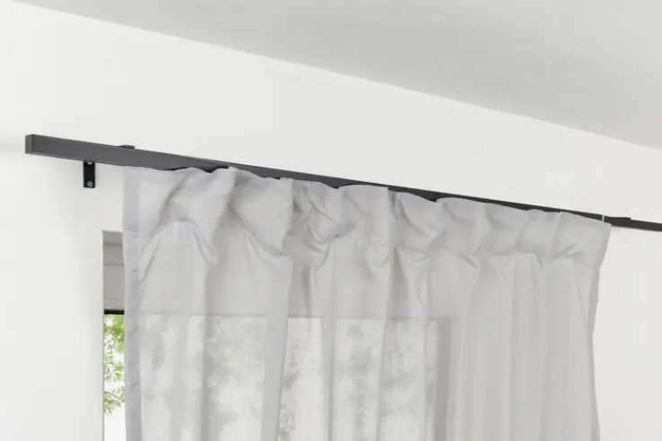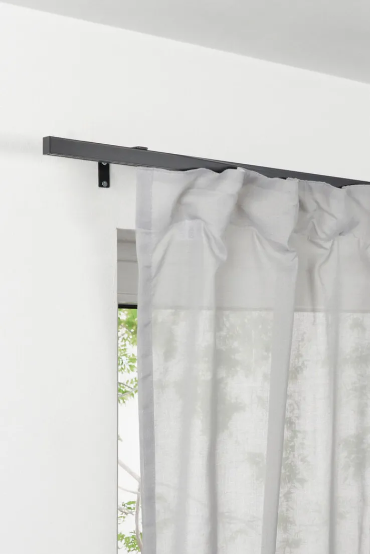 Vorhänge und Gardinen kommen auf der 120 bis 210 Zentimeter langen Stange der schwarzen oder silberfarbigen Teleskopgarnitur ALL IN perfekt in Form. Die Stange ist eckig und kommt ganz ohne Endstücke aus. Der Look ist damit ausgesprochen geradlinig.