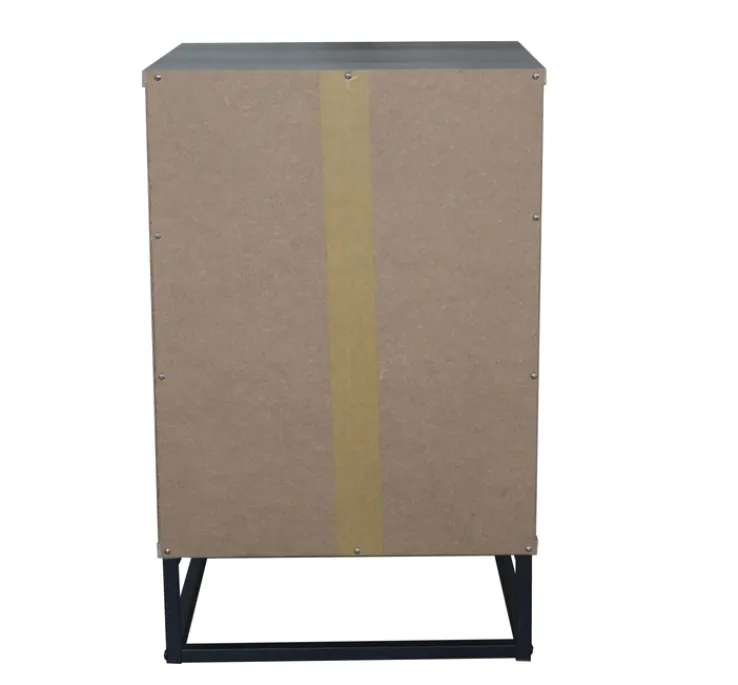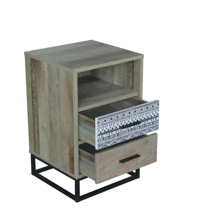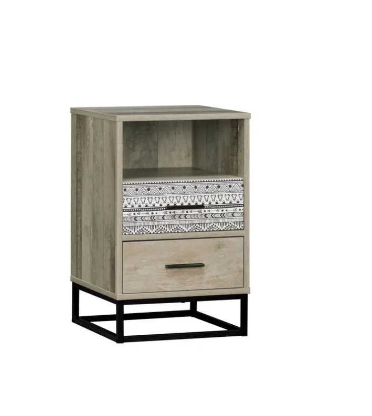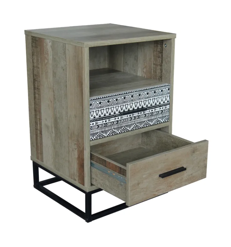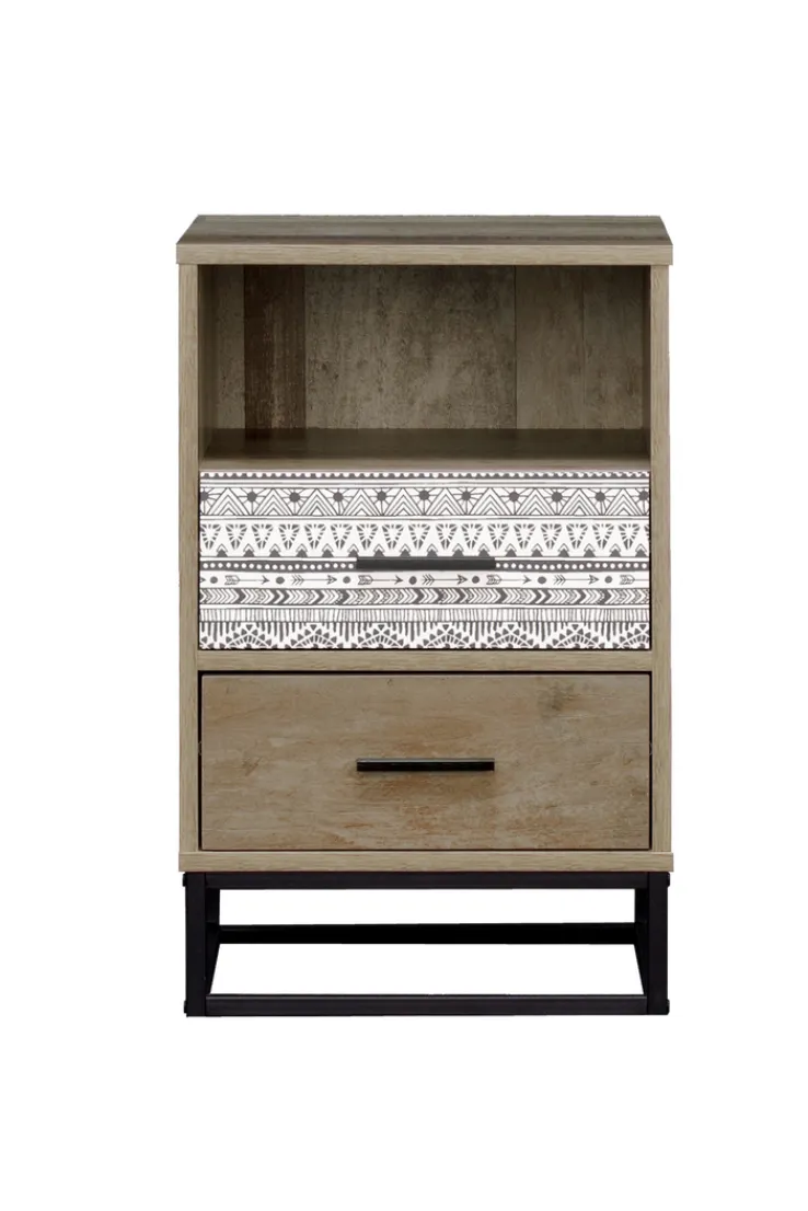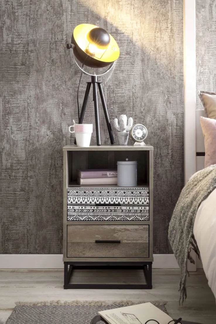 Die Nachtkommode mit einer Breite von 39,5 cm und einer Höhe von 62 cm lebt von ihrem ungewöhnlichen Retro-Look. Sie kombiniert mit spielerischer Leichtigkeit schwarzes Metall, Holzoptik und die schwarz-weiß gemusterte Grafik auf einer Schubladenfront. So kreativ kann Stauraum gestaltet werden!