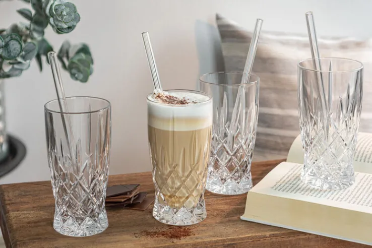 Vier Latte Macchiato Gläser mit einem Volumen von jeweils 350 Millilitern und vier Glastrinkhalme – das ist das Latte Macchiato-Set NOBLESSE von Nachtmann. Das Kristallglas darf in der Spülmaschine gereinigt werden, die Trinkgläser haben jeweils eine Höhe von 14,5 Zentimetern und einen Durchmesser von 7,4 Zentimetern.