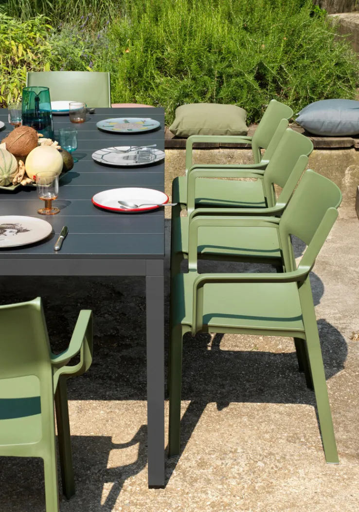 Der recycelbare NARDI Dining Gartenstuhl TRILL besteht aus hochwertigem Polypropylen und lässt sich mit maximal 120 kg belasten. Durch den Kunststoff ist der Stuhl wetterfest und UV-beständig und Sonne und Regen können ihm nichts anhaben. Überzeugen kann der Gartenstuhl außerdem mit einem extravaganten Design: die halboffene Rückenlehne sieht nicht nur stilvoll aus, sie verhindert einen Hitzestau an heißen Tagen und verleiht dem Gartenstuhl einen guten Sitzkomfort. Zudem punktet der Stuhl mit Armlehnen, die das Aufstehen deutlich erleichtern.