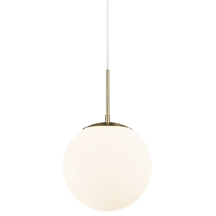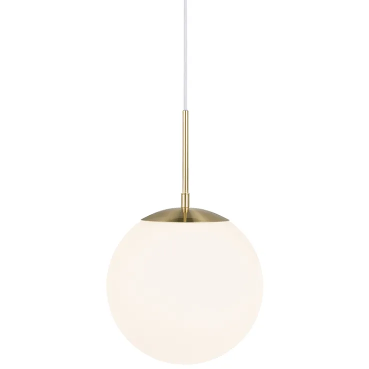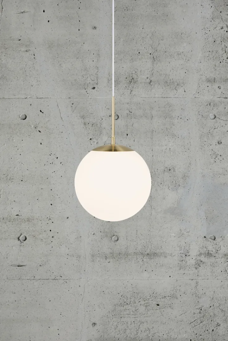 Die Retrofit Pendelleuchte GRANT hat einen Durchmesser von 25 cm. Sie besteht aus weißfarbigem Glas und messingfarbigem Metall. Neben einer Aufhängung als Einzelobjekt ist ein Arrangement in einer Gruppe möglich.
