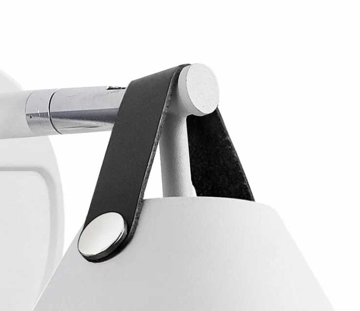 Der Durchmesser der Retrofit Wandleuchte STRAP aus weißfarbigem Metall beträgt 16,5 cm. Dazu kommt ein attraktiver Lederriemen, von dem sich zwei unterschiedlich farbige Varianten im Lieferumfang befinden.