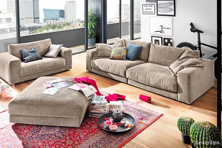 Das große Megasofa SEVENTIES von Ole Gunderson präsentiert sich elegant mit einem Bezug in Cord im attraktiven Farbton taupe. Durch das zeitlose Design passt das schöne Sofa mit einer Breite von 290 cm in modern und klassisch eingerichtete Wohnzimmer. Es ist harmonisch mit Polstersesseln und einem schicken Couchtisch kombinierbar. Die weichen Polster und der hautsympathische Bezug bieten einen hohen Sitzkomfort. Das schöne Megasofa für mindestens drei Personen hat einen echt bezogenen Rücken.