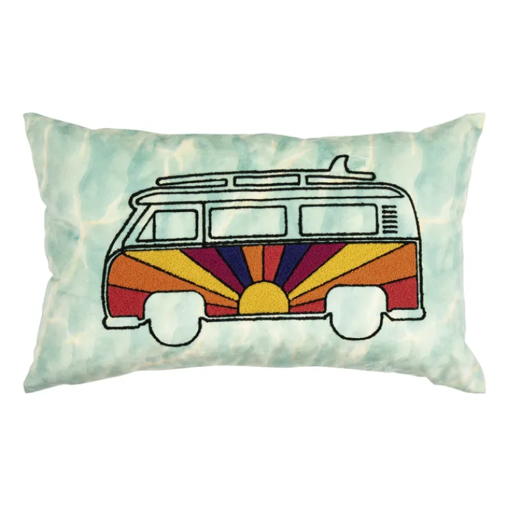 Die Hauptfarbe des Kissens ist Blau, ergänzt durch ein mehrfarbiges Design, das einen stilisierten Bus mit einem Sonnenuntergangsmotiv zeigt. Diese lebendigen Farben und das kreative Muster verleihen jedem Raum eine frische und fröhliche Note. Der Bezug aus Textil sorgt für eine angenehme Haptik und macht das Kissen zu einem komfortablen Accessoire für Ihr Zuhause.