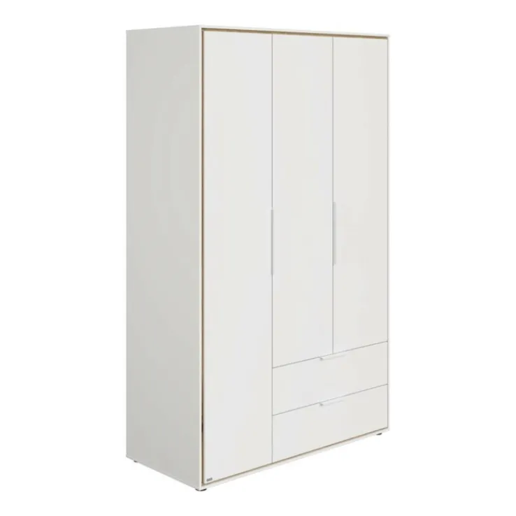 Der dreitürige PAIDI Kleiderschrank LIEVEN weiß bietet viel Stauraum und ist aus robuster Holznachbildung gefertigt. Er ist 125 cm breit, 204 cm hoch und 55 cm tief. Korpus und Fronten sind kreideweiß, die Absetzungen in Eiche Montana NB gehalten.