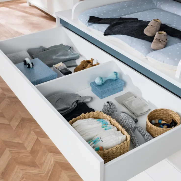 Die PAIDI Wickelkommode OLLI in Weiß / Blau kommt mit einem praktischen Wickelaufsatz in das Babyzimmer. Zudem punktete die Kommode mit jeder Menge Platz und einem stilvollen, modernen Look, der dem Zimmer ein freundliches Ambiente verleiht.