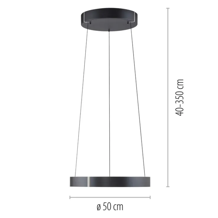 Die graue LED-Pendelleuchte PURE E-CLIPSE mit einem Durchmesser von 50 cm beeindruckt mit ihrer technischen Ausstattung: So lassen sich mit der mitgelieferten Fernbedienung die Höhe und die Farbtemperatur dieser Leuchte aus Metall verstellen.