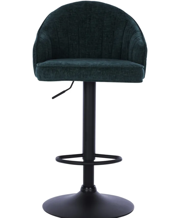 Der hohe Barhocker ist ideal für eine Bar im Partykeller oder für die Mahlzeiten an der Kücheninsel geeignet. Der weiche Bezug ist aus grünem Polyester gearbeitet. Das Säulengestell aus schwarzem Metall verfügt über eine Ablage für die Füße. Insgesamt kann der Stuhl bis zu einem Gewicht von 120 Kilogramm belastet werden.