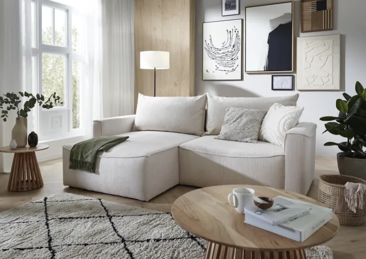 Das Ecksofa LILLY in Creme überzeugt durch sein stilvolles Design und eine hohe Funktionalität. Der Cordbezug verleiht dem Sofa eine gemütliche und einladende Optik, während die weiche Polsterung aus Schaumstoff auf einer Wellenunterfederung höchsten Sitzkomfort gewährleistet. Das Ecksofa ist universell und kann je nach Wunsch rechts oder linksseitig aufgebaut werden. Es kann auch zu einem späteren Zeitpunkt gewechselt werden.