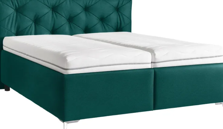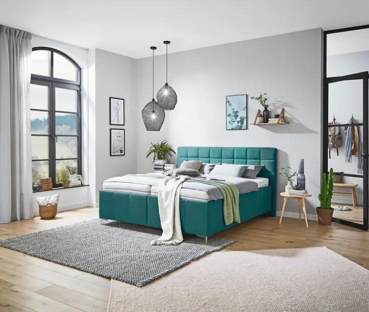 Das Polsterbett der Serie PALLAS bietet eine großzügige Liegefläche von 180 x 200 cm und überzeugt durch seine elegante Gestaltung. Der Bezug in einem ansprechenden Grünblau verleiht dem Bett eine moderne und zugleich zeitlose Optik. Das Kopfteil ist mit einer stilvollen Steppung versehen, die dem Bett eine zusätzliche visuelle Tiefe verleiht. Die Maße des Bettes betragen 198 cm in der Breite, 113 cm in der Höhe und 212 cm in der Tiefe, was es zu einem imposanten Möbelstück in jedem Schlafzimmer macht.