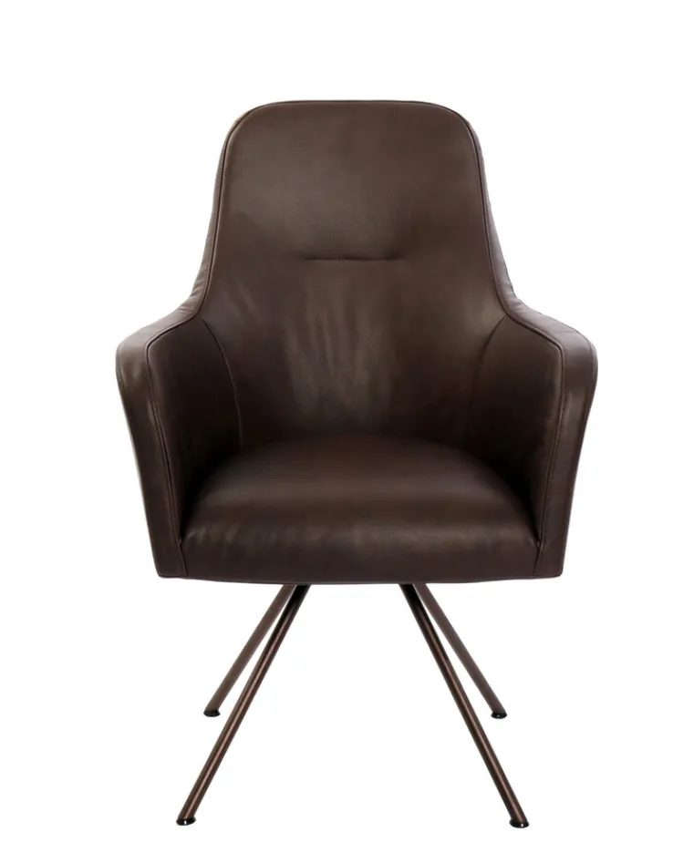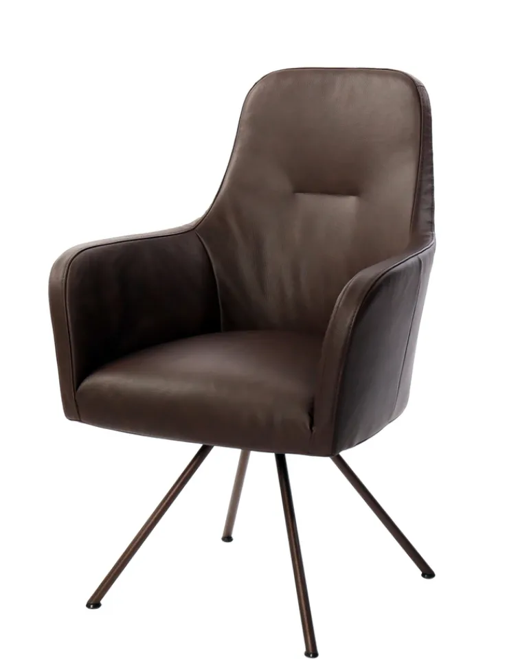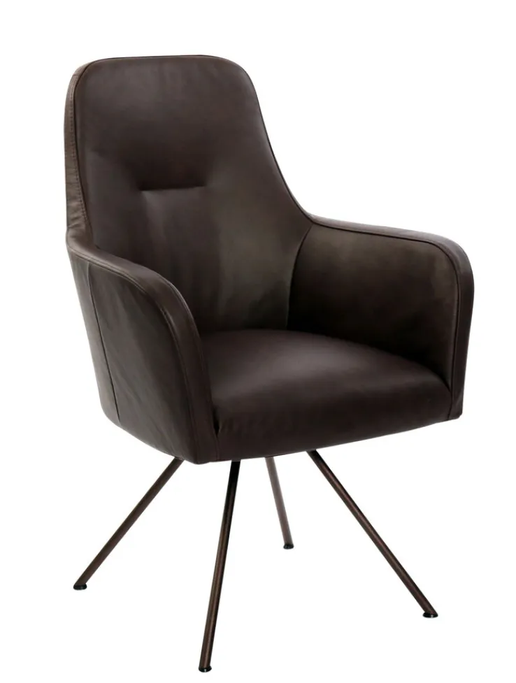 Der Armlehnstuhl aus der Serie RENATA präsentiert sich in einem modernen, industriellen Design. Die Sitzschale ist mit braunem Leder bezogen, das eine glatte, matte Oberfläche mit dezentem Glanz aufweist. Die klare Linienführung und die ergonomisch geformten Armlehnen verleihen dem Stuhl eine schlichte und zugleich charakteristische Optik. Das Vierfußgestell besteht aus pulverbeschichtetem Metall in dunklem Farbton und sorgt für Stabilität sowie einen zeitgemäßen Akzent. Die Sitzfläche und Rückenlehne sind weich gepolstert und bieten guten Sitzkomfort. Der Stuhl ist drehbar und die Armlehnen sind fest integriert. Mit einer maximalen Belastbarkeit von 120 kg, einer Sitzhöhe von 52 cm und einer Sitztiefe von 47 cm eignet sich dieser Stuhl sowohl für das Esszimmer als auch den Wohnbereich. Die Maße betragen 68 cm in der Tiefe, 63 cm in der Breite und 95 cm in der Höhe, bei einem Gewicht von 15 kg. Die Materialkombination aus Leder und Metall sowie das moderne Design machen ihn zu einer passenden Wahl für unterschiedliche Einrichtungsstile.