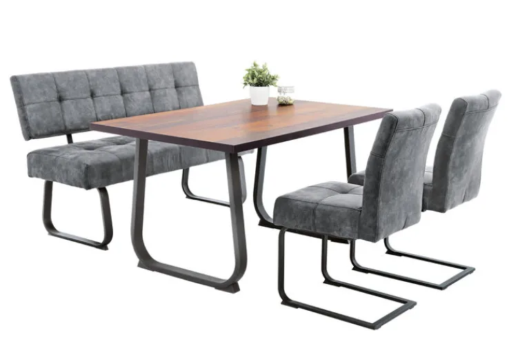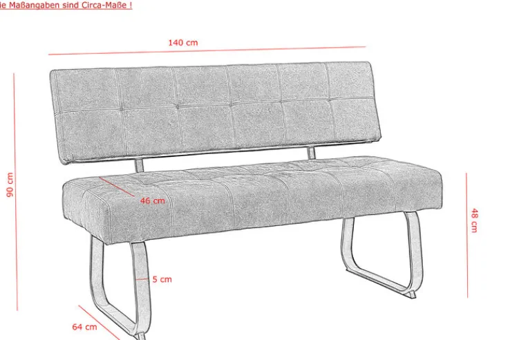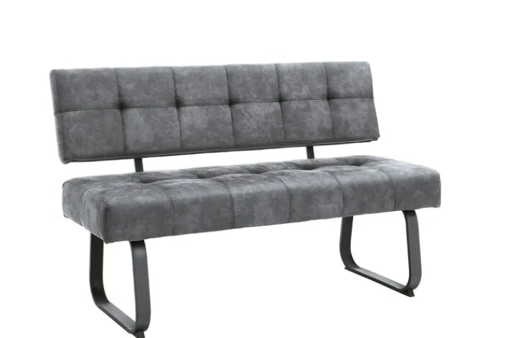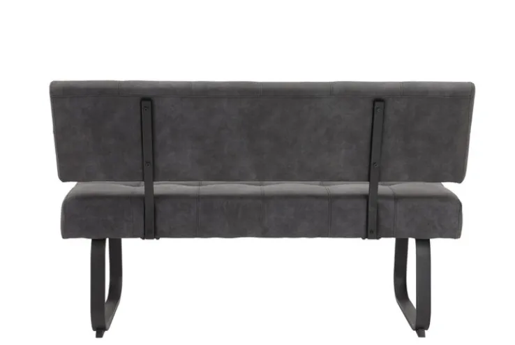 Mit einer Sitzhöhe von 48 cm ist die Bank LUISE als Sitzgelegenheit am Esstisch hervorragend geeignet. In Kombination mit anderen Polstermöbeln kann sie auch als Blickfang im Wohnzimmer dienen. Freistehend kommt das Kufengestell aus dunklem Metall besonders gut zur Geltung.
