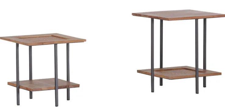 Der Beistelltisch TOM ist ein 2er-Set. Beide Teile zeigen Ablagen aus massiver Akazie. Das lackierte Metallgestell dagegen ist in Anthrazit gehalten. Die Tische verfügen jeweils über zwei Ablagen.