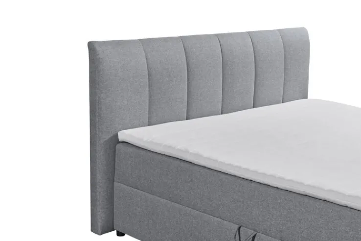 Das Bett besitzt ein hochwertiges Gestell und robuste Kunststoffüße, die mit ihrem intensiven Schwarz einen gelungenen Kontrast zu dem hellgrauen Textilbezug bilden. Außerdem ist es mit einer gepolsterten Kopfstütze mit dekorativen Steppungen ausgestattet. Für die komfortable Liegefläche sorgen die Federkernmatratze und der hochwertige Schaum-Topper. Die Matratze besitzt einen waschbaren Bezug. Die klare Formgebung und die dezente Farbe verleiht dem Bett einen modernen und zugleich minimalistischen Charakter, was es zu einem wahren Kombinationstalent macht.