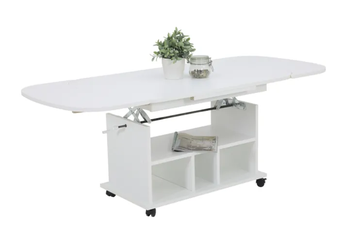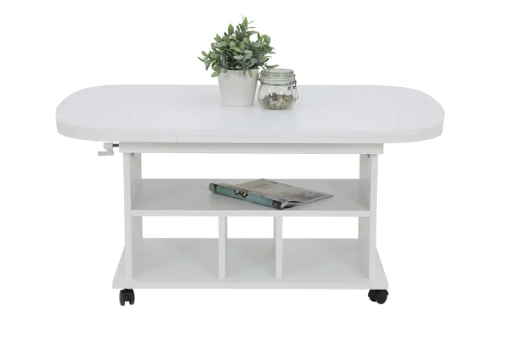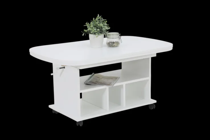 Stauraum und eine ausziehbare Tischplatte machen den weißen Couchtisch BABSI III zu einem äußerst praktischen Möbelstück im Haus. Hinzu kommt, dass dieser Tisch ein freundliches und liebliches Design hat.